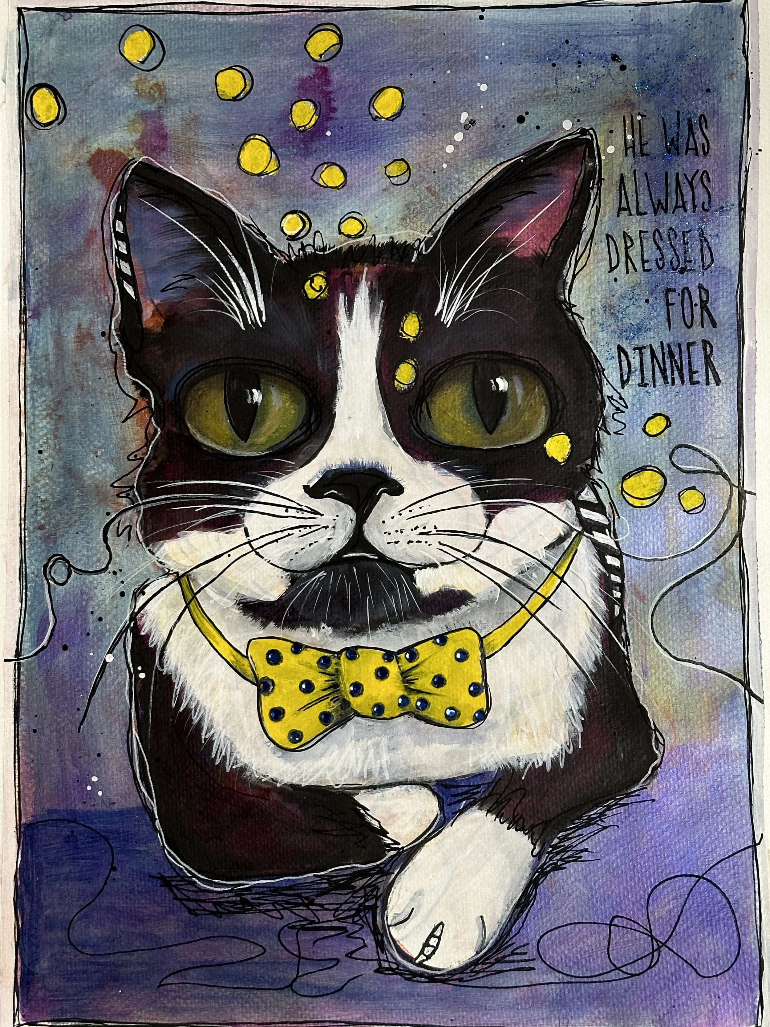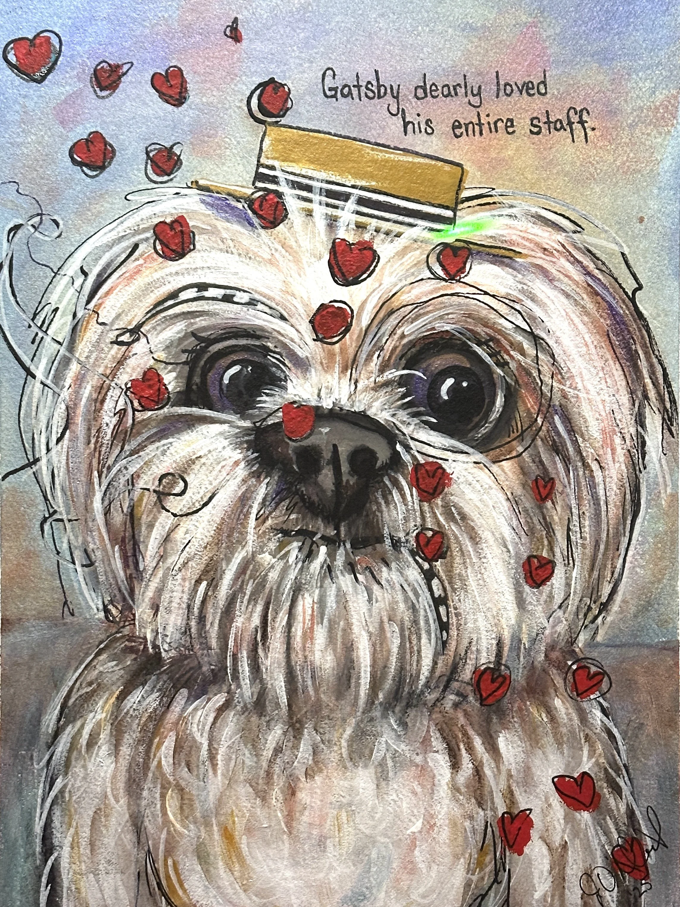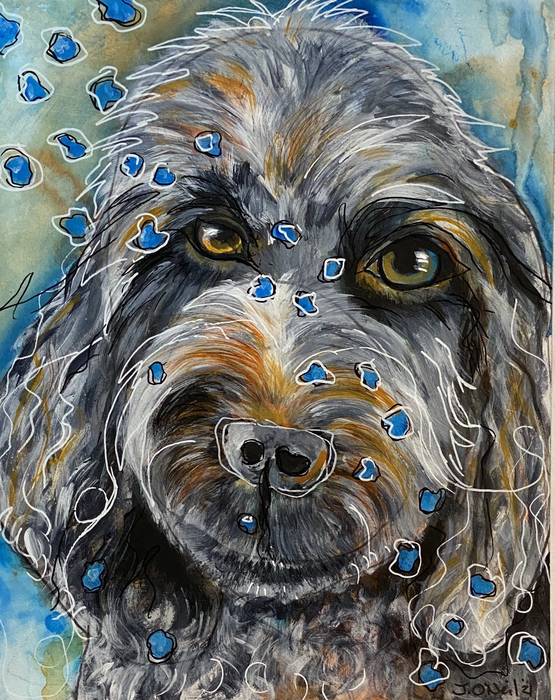 I specialize in wonky pet portraits, using non-traditional colors, a spoonful of personality and a pinch of silliness. Customized to your specs, but typically done on 10 X 13” paper (ready to frame) or 12 X 12” canvas (ready to hang). $200 includes shipping within the U.S. Contact me directly for a pet portrait.